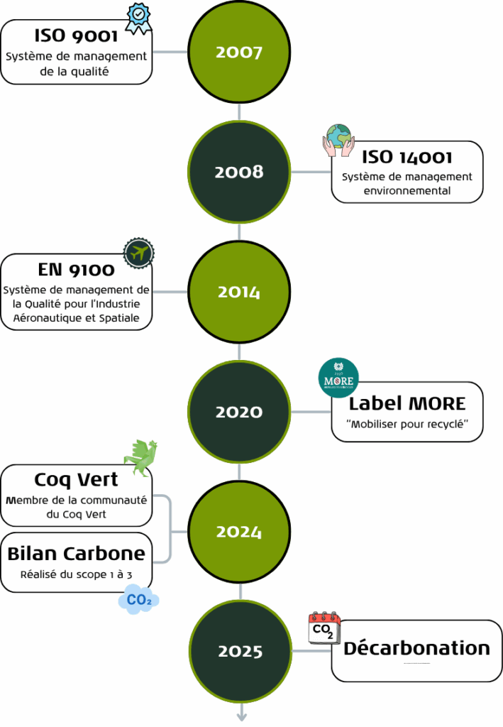 L’entreprise est certifiée ISO 9001 (système de management qualité) depuis 2007, ISO 14001 (système de management environnemental) depuis 2008, et EN 9100 (Système de management de la Qualité pour l’Industrie Aéronautique et Spatiale) pour ses activités aéronautiques depuis 2014. Elle est également certifiée MORE (MObilisés pour REcyclé) depuis 2020. Une reconnaissance qui révèle la qualité de son savoir-faire : conformité des pièces, sécurité des délais, optimisation de la productivité, anticipation de la montée en charge, performance environnementale…