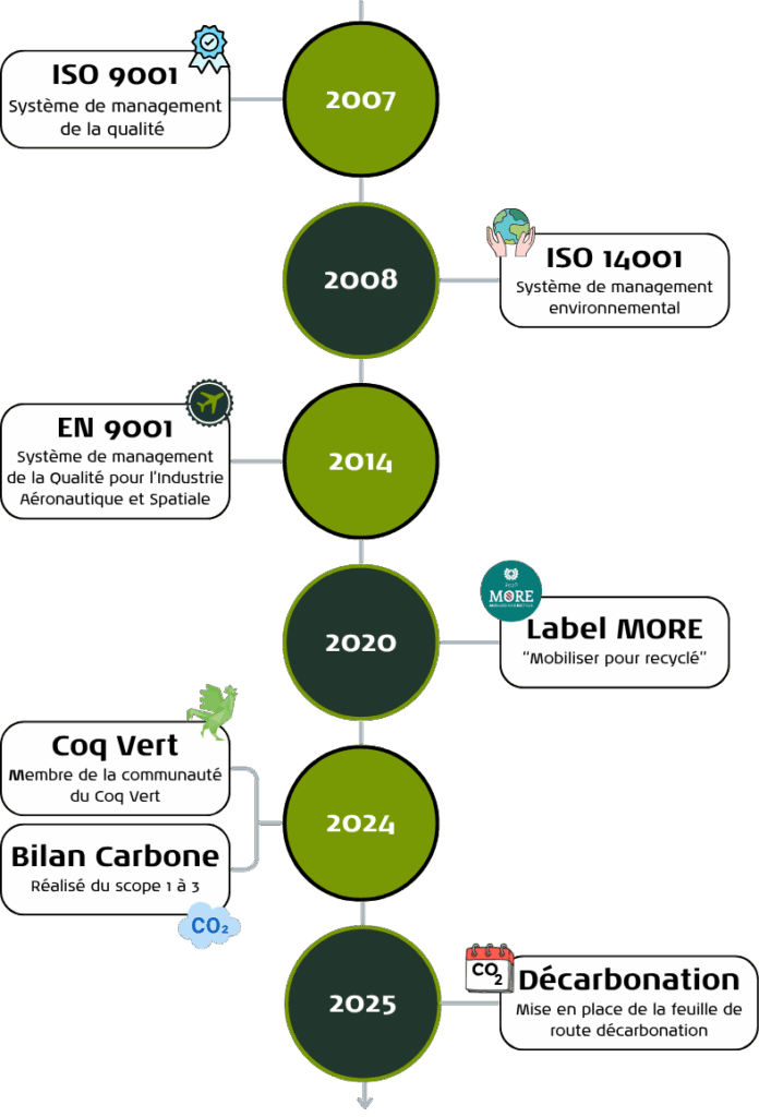 L’entreprise est certifiée ISO 9001 depuis 2007, ISO 14001 depuis 2008, EN 9100 depuis 2014 et obtient le label MORE en 2020. Une reconnaissance qui révèle la qualité de son savoir-faire : conformité des pièces, sécurité des délais, optimisation de la productivité, anticipation de la montée en charge, performance environnementale…
